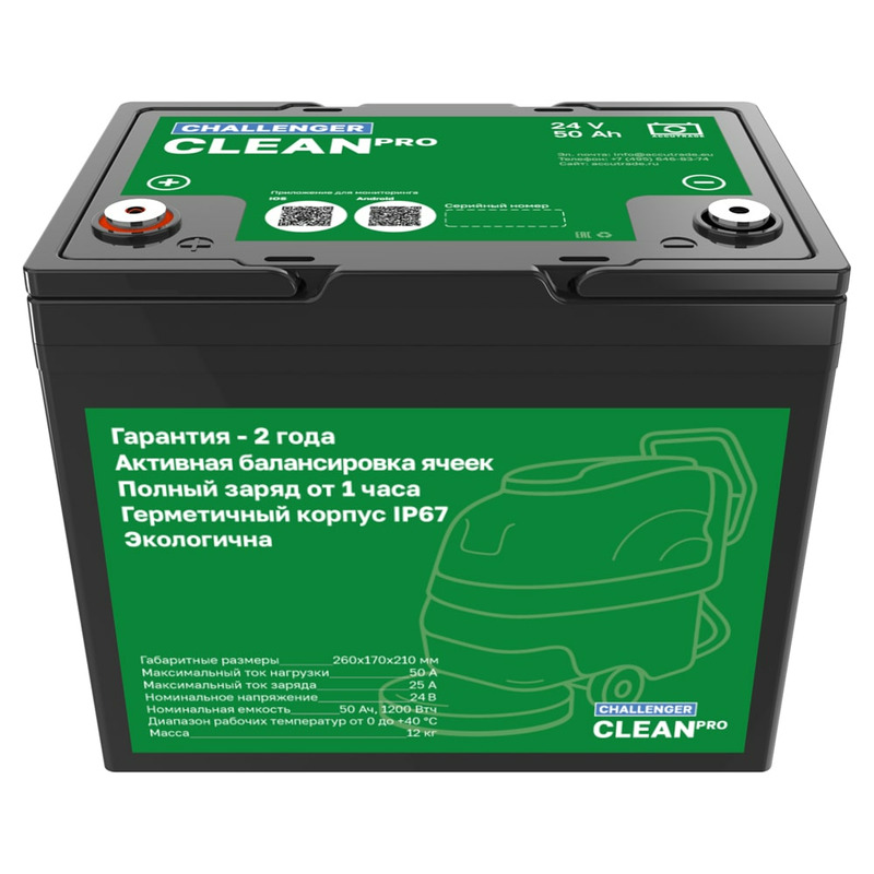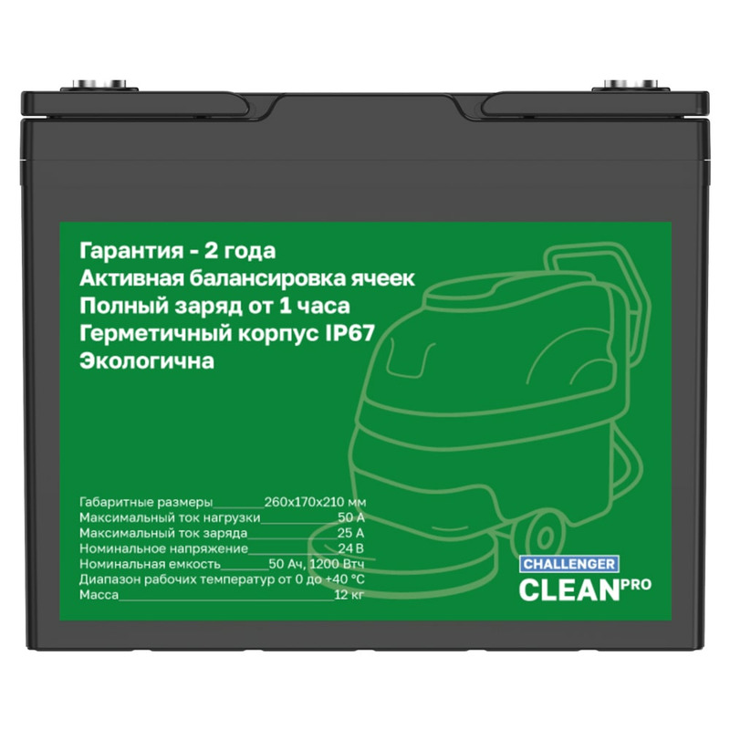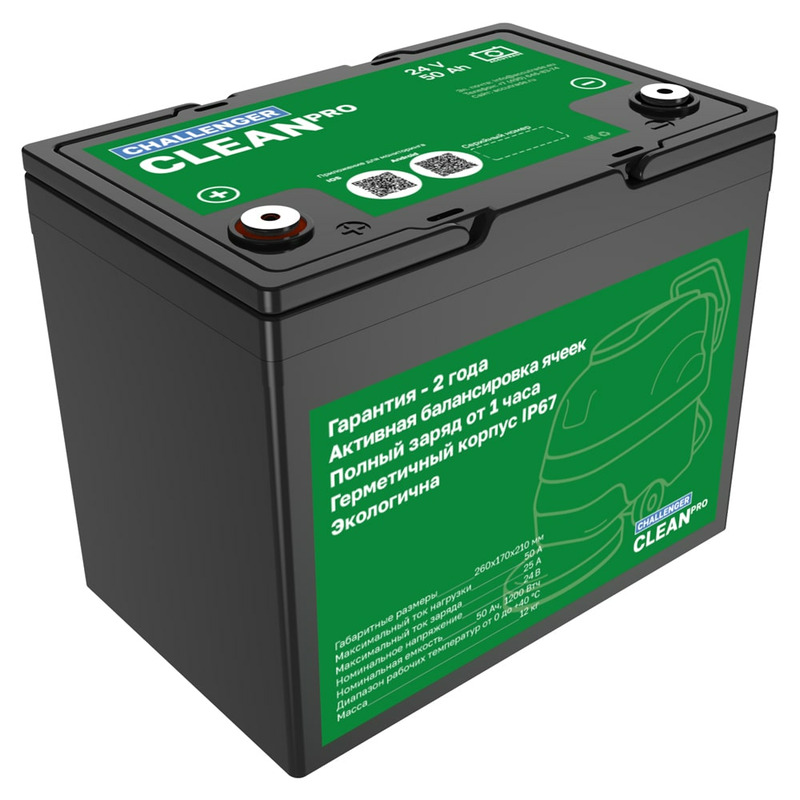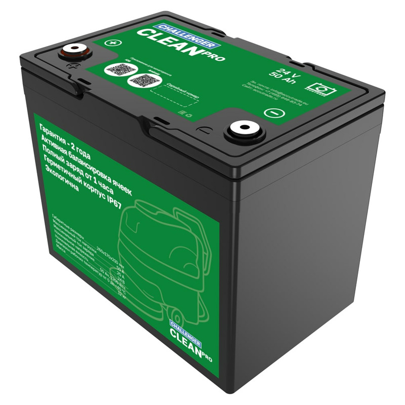 Аккумулятор Challenger 24V 50Ah Clean PRO - литиевый аккумулятор ёмкостью 50 Ач, энергоёмкостью 768 Втч и напряжением 24 В, собранный по технологии LiFePO4 со встроенной BMS. Серия Clean PRO разработана специально для использования в профессиональной клининговой технике. Литий-железо-фосфатный аккумулятор Challenger 24V 50Ah Clean PRO — идеальное решение для вашей профессиональной клининговой техники. Разработанный специально для обеспечения максимальной производительности и надёжности, он гарантирует непревзойденное качество работы. Батарея оснащена передовыми системами защиты от перезаряда, глубокого разряда, короткого замыкания и экстремальных температур, что делает её идеальным выбором для работы в самых разных условиях. А самое главное – ресурс аккумулятора составляет более 3000 циклов с глубиной разряда 80%.