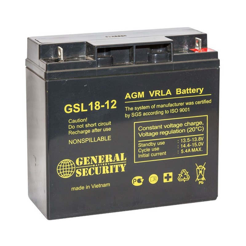 General Security GSL 18-12L – свинцово-кислотный аккумулятор, напряжением 12В и ёмкостью 18А*ч. Наилучшее использование такой батареи достигается в буферном режиме. Аккумулятор может храниться при температуре при 25°С в течение 6 месяцев, саморазряд составит 3% в месяц. Корпус АКБ выполнен из ABS материала (акрило-бутадиен-стирол), который обеспечивает герметичность.