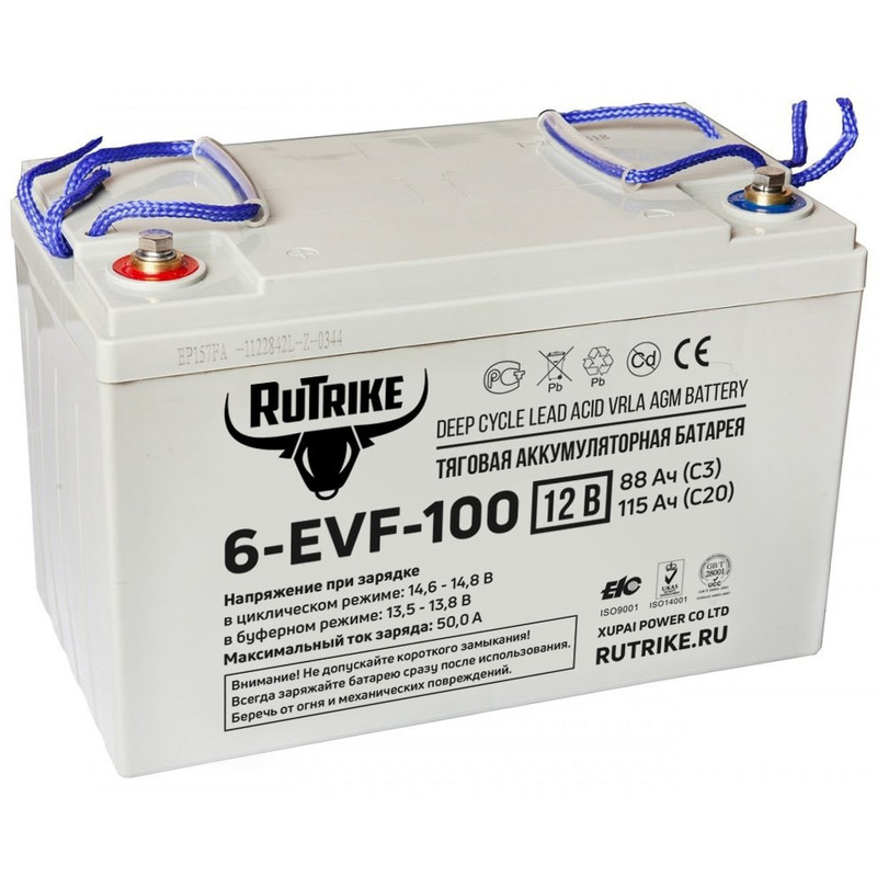 Rutrike 6-EVF-100 - необслуживаемая аккумуляторная батарея с системой рекомбинации газов (VRLA) произведенная по технологии AGM. Батареи выполнены по технологии внутреннего формования. В свинцовых пластинах, имеющих большую толщину по сравнению со стандартными аккумуляторами, используется экологичный запатентованный сплав без кадмия и мышьяка. Плотный сепаратор из углеволокна пропитан электролитом, изготовленным по технологии NANO GEL. Электролит находится в сгущенном состоянии, не даёт утечек и не требует долива воды на протяжении всего срока эксплуатации.