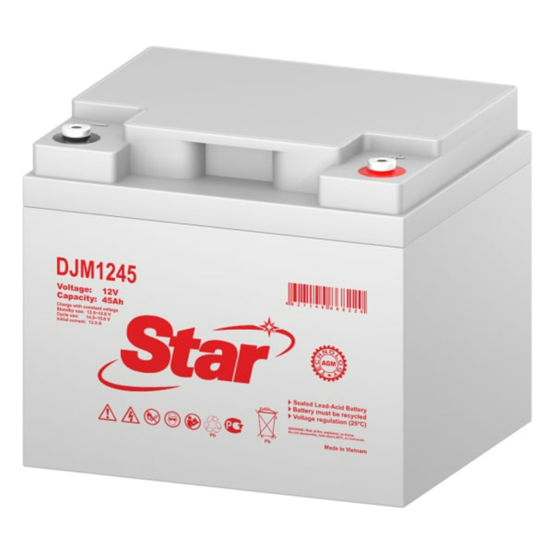 Аккумуляторные батареи STAR серии DJM – необслуживаемые (выполненные по AGM–технологии) батареи общего применения, имеют небольшие массогабаритные показатели; способны работать в циклическом режиме; герметизированы – не требуют долива воды; безопасны в эксплуатации; имеют низкий уровень саморазряда; высоконадежны. Предназначены для обеспечения резервным питанием систем охраны и пожарной безопасности, телекоммуникационного оборудования и связи, промышленных объектов широкого назначения, работы в ИБП (UPS).