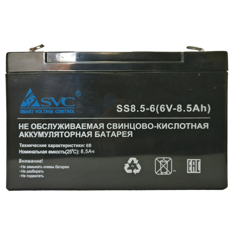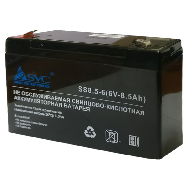 Аккумулятор SVC SS8.5-6 - необслуживаемая батарея, не требует доливки воды, предназначена для работы в циклическом режиме (выдерживает до 600 циклов). Низкий уровень саморазрядки обеспечивает срок службы от 2 до 4 лет в резервном (буферном) режиме. Герметичная конструкция позволяет использовать батарею в любом положении. Основная сфера применения данной продукции - источники бесперебойного питания (UPS) любой мощности и конфигурации. Также данные батареи широко используются в пожарном, охранном и прочем оборудовании, требующем резервного питания. На сегодняшний день вне конкуренции по соотношению цена/качество.