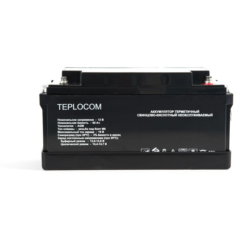 TEPLOCOM 65 - аккумулятор герметичный свинцово-кислотный необслуживаемый, производится по технологии AGM (Absorbent Glass Mat) с системой рекомбинации газов VLRA и предназначен для использования в составе системы резервного питания.