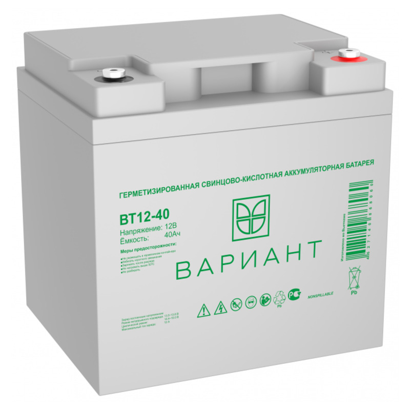 Аккумулятор Вариант серии ВТ12-40 - герметизированные, выполненные по технологии AGM, свинцово-кислотные аккумуляторные батареи общего применения со сроком службы до 12 лет в буферном режиме или более 260 циклов заряд-разряда в циклическом режиме при 100% разряде. Эти высокоэффективные перезаряжаемые батареи не требуют обслуживания в течении всего срока службы.