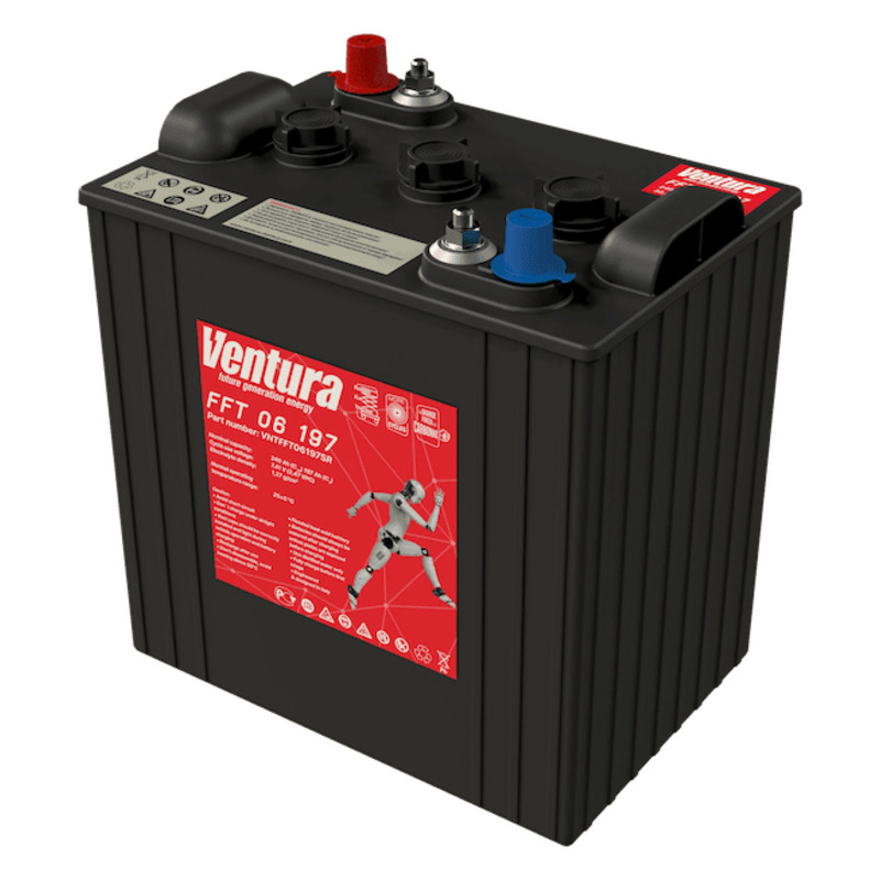Тяговый аккумулятор Ventura FFT 06 197 производится ёмкостью C5 197 Ач и напряжением 6 В с применением технологии WET. Главная особенность этой батареи — продолжительный срок службы: до 1000 циклов при DOD = 60%. Внутри тягового АКБ Ventura FFT 06 197 расположены трубчатые пластины из специального сплава. Это обеспечивает быструю подзарядку батареи за счёт низкого внутреннего сопротивления. Тяговый аккумулятор Ventura FFT 06 197 разработан специально для работы в тяжёлых условиях. Эксплуатировать батарею можно даже в экстремальных условиях.