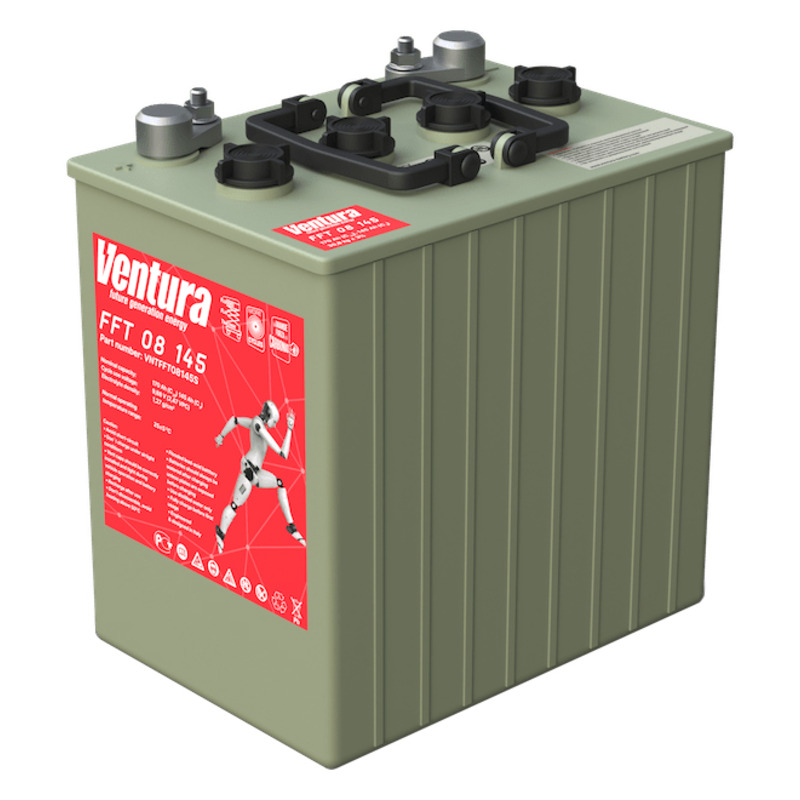 Тяговый аккумулятор Ventura FFT 08 145 производится ёмкостью C5 145 Ач и напряжением 8 В с применением технологии WET. Главная особенность этой батареи — продолжительный срок службы: до 1000 циклов при DOD = 60%. Внутри тягового АКБ Ventura FFT 08 145 расположены трубчатые пластины из специального сплава. Это обеспечивает быструю подзарядку батареи за счёт низкого внутреннего сопротивления. Тяговый аккумулятор Ventura FFT 08 145 разработан специально для работы в тяжёлых условиях. Эксплуатировать батарею можно даже в экстремальных условиях.