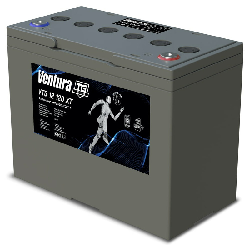 Премиальный тяговый аккумулятор Ventura VTG 12 120 XT напряжением 12 В и ёмкостью 108 Ач производится по технологии TRUE GEL (TRUE GEL X-TRA) с применением улучшенной конструкции с усиленными решётками. Главная особенность серии — съёмные конусные выводы A-POL, позволяющие легко менять тип клемм на резьбу под болт. Электролит находится в загущенном желеобразном состоянии, что обеспечивает повышенную надёжность, устойчивость к вибрациям, перепадам температур и глубоким разрядам. Тяговая гелевая батарея Ventura VTG 12 120 XT подходит для работы как в буферном режиме, так и в циклическом, обеспечивая до 15 лет работы или 1500 циклов заряда-разряда. Аккумулятор надёжно герметизирован и защищён от проливания. На крышке ударопрочного корпуса располагаются высококлассные клапаны избыточного давления (VRLA), которые гарантируют безопасную работу и транспортировку в любом положении. Обслуживание на протяжении всего срока службы тягового гелевого акб не требуется. Благодаря низкому % саморазряда Ventura VTG 12 120 XT может храниться без подзарядки до 2 лет.