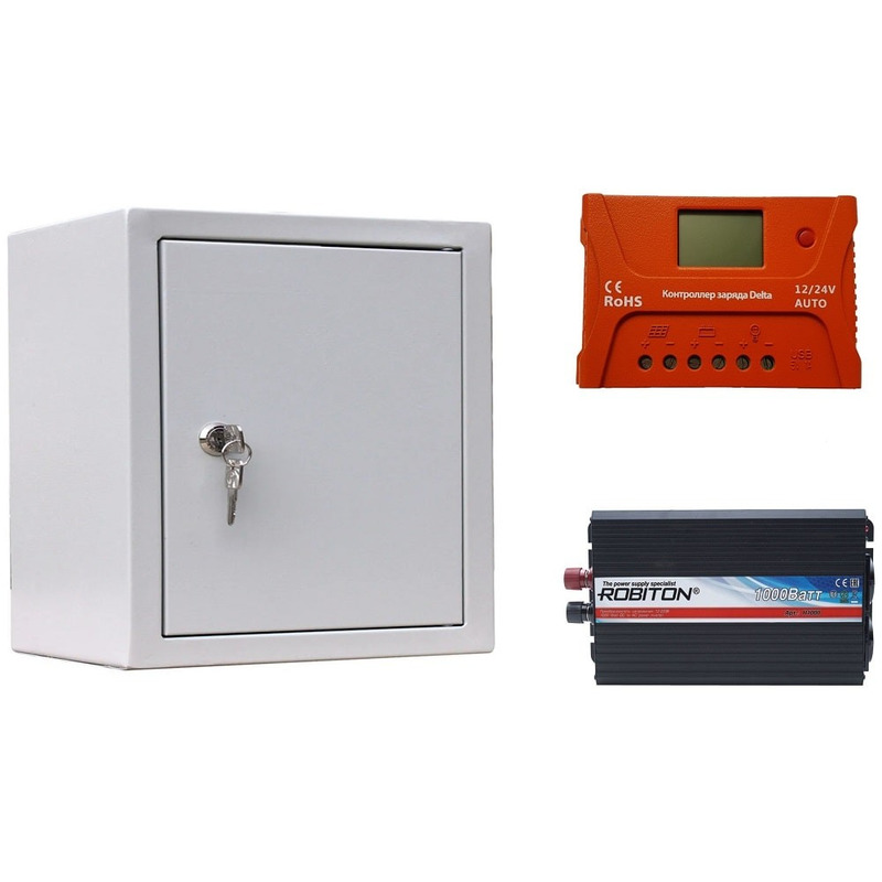 Щит автоматики СЭС "Мобильная 1000" используется в составе автономных солнечных электростанций с напряжением системы 12 В и на выходе выдаёт 220 В. Входящий в его состав контроллер с током заряда 30 А даёт возможность подключить солнечные панели мощностью до 500 Вт. Инвертор позволяет подключить электроприборы с максимальной мощностью до 1000 Вт. Установка аккумуляторов снаружи.
