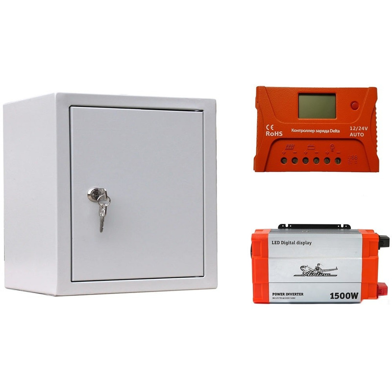 Щит автоматики СЭС "Стандарт 1500" используется в составе автономных солнечных электростанций с напряжением системы 12 В и на выходе выдаёт 220 В. Входящий в его состав контроллер с током заряда 30 А даёт возможность подключить солнечные панели мощностью до 500 Вт. Инвертор позволяет подключить электроприборы с максимальной мощностью до 1500 Вт. Установка аккумуляторов снаружи.