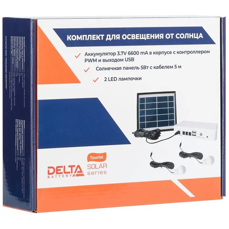 Зарядная министанция Delta Tourist Camper 2 представляет собой портативный комплект освещения от солнечных модулей. Данное решение подойдет для использования в загородных домах, кемпингах и в поездках. Разместите модуль на открытом пространстве вне помещения, лампочки закрепите в точках освещения. Доступной мощности хватает до 16 часов. Powerbank обладает USB выходами 1A, которые позволяют заряжать мобильные гаджеты. Полная зарядка батареи происходит за 3-4 часа, в зависимости от погодных условий.