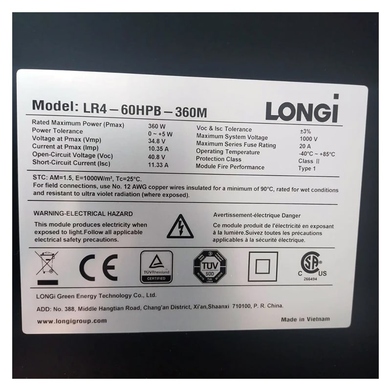 Характеристики Солнечный модуль Longi Solar 360M LR4-60HPB-360W (Black Profile)