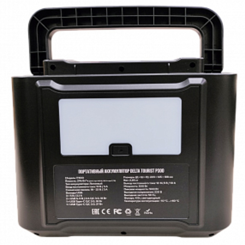 DELTA Tourist P300 - мощный портативный аккумулятор с возможностью заряда от солнечных модулей и сети 220 В. P300 обладает компактными размерами и значительной емкостью 80 000 мА*ч. Оснащён двумя розетками 220 В, суммарной мощностью 300 Вт, двумя DC выходами: 12V/10A, пятью USB-A выходами: 5W/1A, 5W/2A, 5W/3A, QC3.0 18W, QC3.0 18W, TYPE-C 18W, TYPE-C 27W, входом для заряда от солнца, кабелем MC4, переходником для прикуривателя, фонарём 4W. Ёмкости powerbank хватит для одновременного питания нескольких гаджетов. Каждая из розеток переменного напряжения может запитывать нагрузку 300 Вт, суммарная мощность на обоих розетках не должна превышать 300 Вт, кратковременная пиковая мощность 500 Вт.