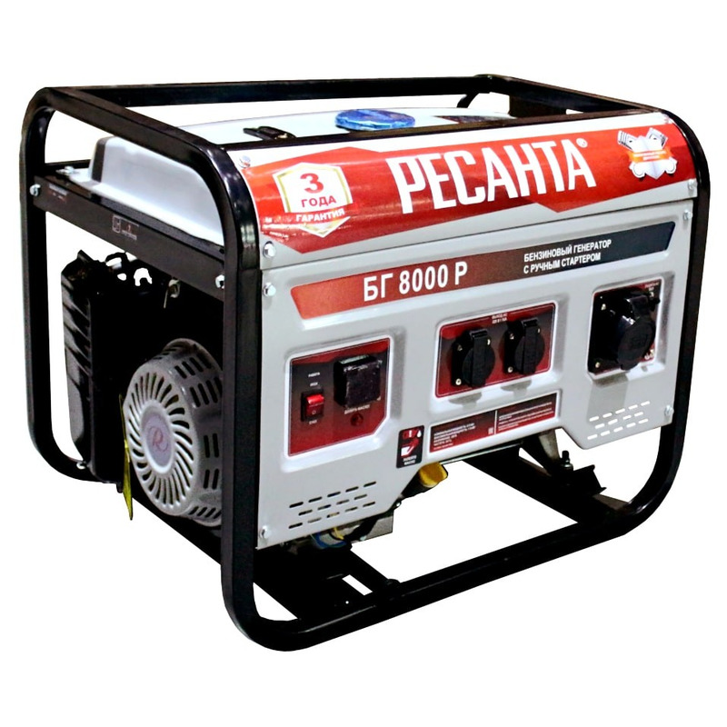 Бензиновый генератор БГ 8000 Р Ресанта - электрическая машина, предназначенная для автономного электроснабжения в повторнократковременном режиме потребителей бытового и аналогичного назначения, относящихся к классу переносных электроприемников. В качестве первичного двигателя используется карбюраторный двигатель, топливом для которого является неэтилированный бензин.