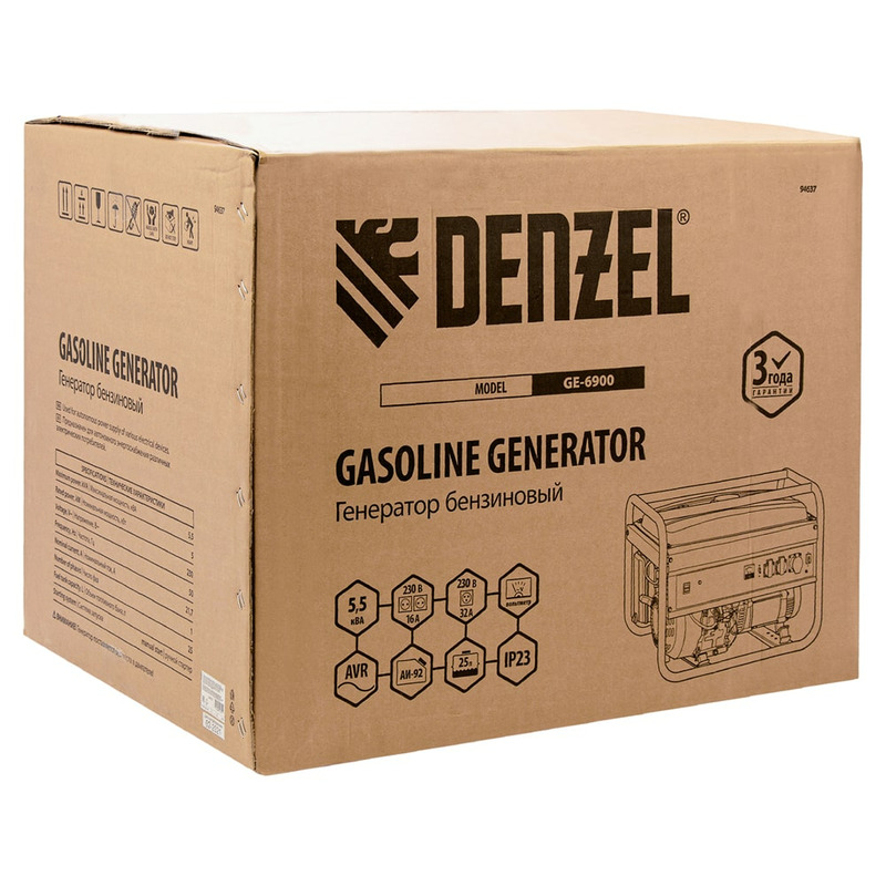 Бензиновый генератор Denzel GE 6900 94637 мощностью 5.5 кВт, 220 В / 50 Гц, с ручным стартом и баком объемом 25 л подходит для использования в загородном доме, в торговой точке, на стройке или предприятии. Одновременно к нему можно подключить, например, 4 лампы накаливания, холодильник, телевизор и чайник. Силовая розетка позволяет подключать мощное электрооборудование. Полного бака хватает на 10 ч работы без дозаправки.