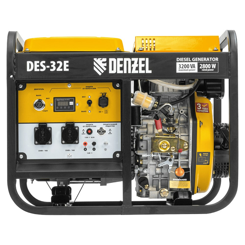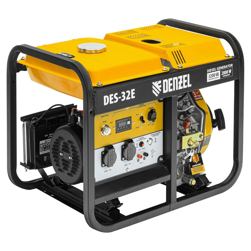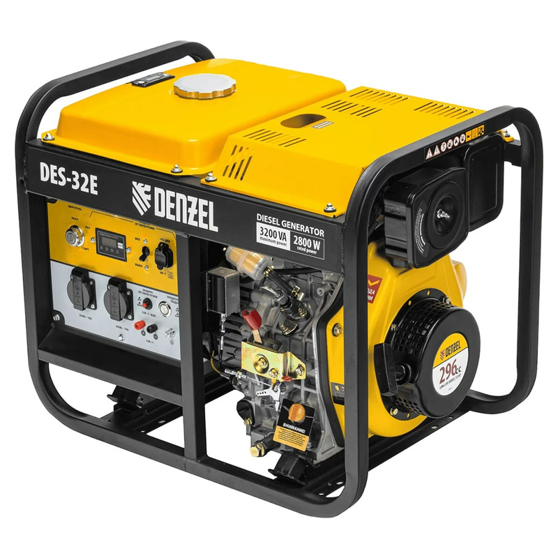 Генератор дизельный Denzel DES-32E 94412 с объемом топливного бака 11 л, с электростартером имеет максимальную выходную мощность 3,2 кВт и поддерживает напряжение в сети 230 В. Используется для снабжения энергией потребителей однофазного тока (осветительных приборов, бытовой техники, электроинструмента) при отсутствии доступа к стационарному источнику питания. Для подключения электроприборов служат 2 розетки 230 В/16 А. Клеммы постоянного тока 12 В позволяют заряжать автомобильные аккумуляторы, а двойной выход USB 5 В предназначен для подключения мобильных устройств (планшетов, смартфонов и т. д.). Генератор пригодится в загородном доме.
