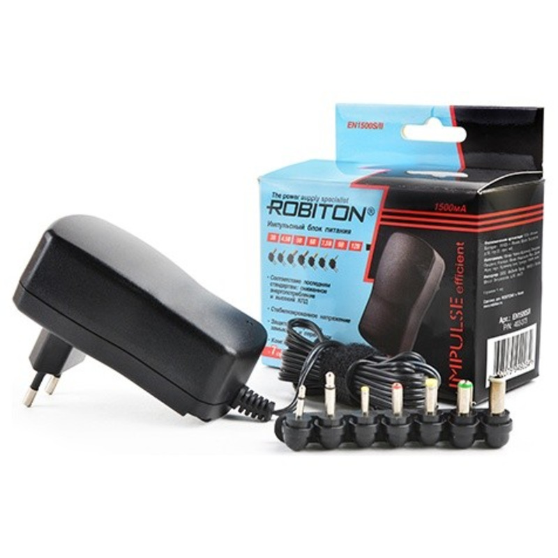 ROBITON EN1500S/II - импульсный блок питания 1500 мА. Предназначен для питания от источника переменного тока 100-240 В приборов с напряжением 3,0 / 4,5/ 5,0/ 6,0 / 7,5 / 9,0 / 12,0 В и максимальным входным током 1500 мА. Набор из 7 наиболее распространенных входных насадок и выбор полярности позволяют использовать его для питания большого количества современных электроприборов, цифровых устройств, устройств автоматики и др. Автоматическая защита от короткого замыкания и защита от перегрузок.
