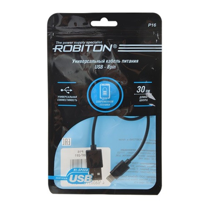 Кабель USB ROBITON P16 USB A - 8pin (AppleLightning), 0,3м черный PH1 15994