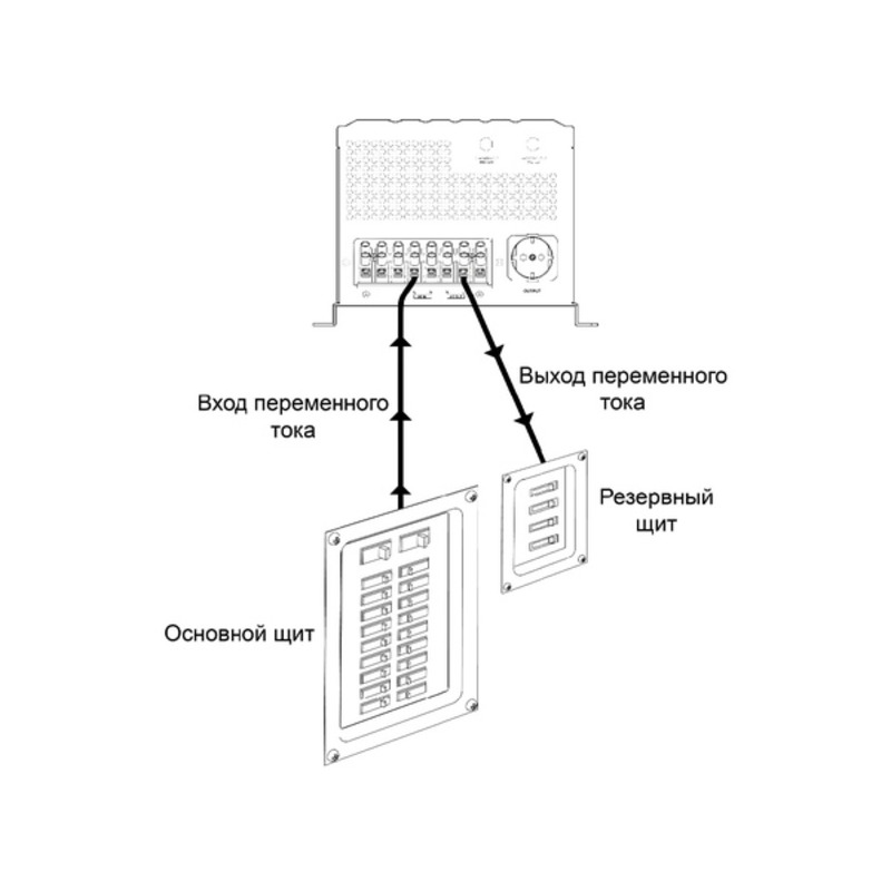 • Евро розетка и клеммная колодка: Евро розетка на задней панели ИБП дают возможность самостоятельно и быстро подключить нагрузку. Клеммная колодка позволяет надёжно подключить фазозависимый котёл отопления, циркуляционные насосы или резервный щит