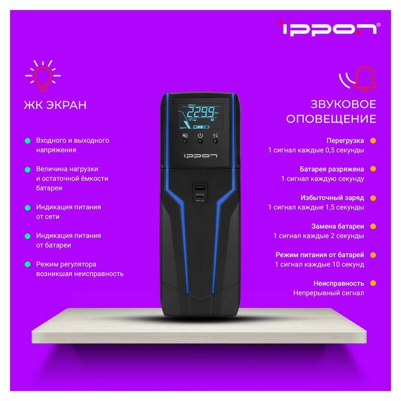 ИБП обеспечит надежную защиту оборудования и аксессуаров от внезапных отключений электроэнергии и нестабильности сети. Линейно-интерактивная технология с чистой синусоидой гарантирует стабильное и высококачественное питание, а встроенные функции защиты от перегрузки, перепадов напряжения предотвращают повреждение вашего оборудования и возможные сбои.