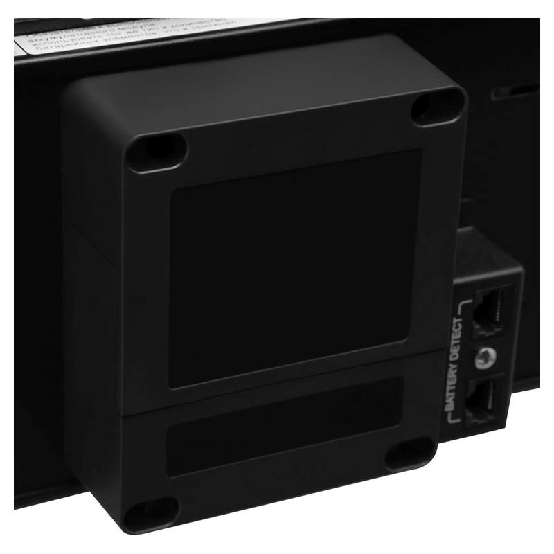 На передней панели ИБП размещён ЖК-экран, на котором отображается информация о режиме работы, состоянии нагрузки, событиях, измерениях и настройках и переключения рабочих режимов. Кнопки управления на передней панели позволяют пользователям выключить звуковое оповещение при неполадках питающего переменного напряжения или запустить тест последовательной самодиагностики ИБП и кнопки управления. Подсветка дисплея автоматически гаснет через 10 минут бездействия.