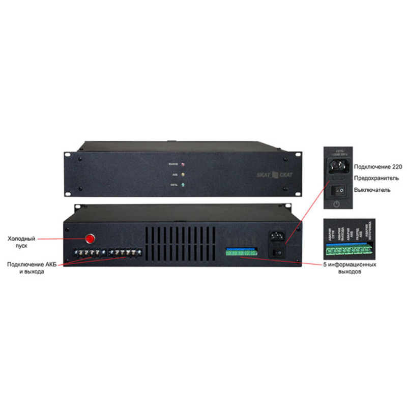 - Возможность восстановления работоспособности источника при подключении исправной и заряженной внешней АКБ и отсутствии напряжения питающей сети («холодный запуск»)