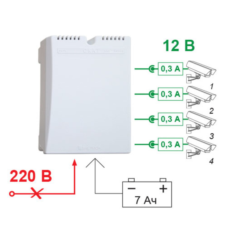 - Питание видеокамер и других потребителей с номинальным напряжением питания 12 В, посредством четырёх отдельных выходов с током нагрузки не более 0,35 А по каждому выходу