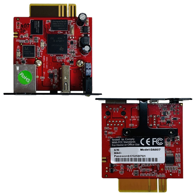 SNMP-карта SVC DA807 - аналог карты DY802, но с возможностью мониторинга температуры, влажности и затопляемости окружающей среды при подключенном соответствующем датчике USB Netfeeler.