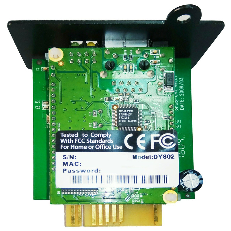 SNMP-карта SVC DY802 предназначена для удаленного мониторинга и управления ИБП через локальную сеть или Интернет. Позволяет в режиме реального времени получать информацию о состоянии электросети и ИБП. Благодаря наличию встроенного http-сервера доступ к карте может осуществляться через любой веб-браузер.