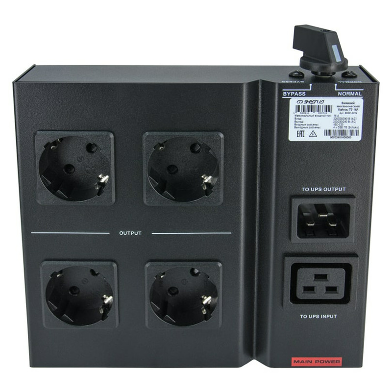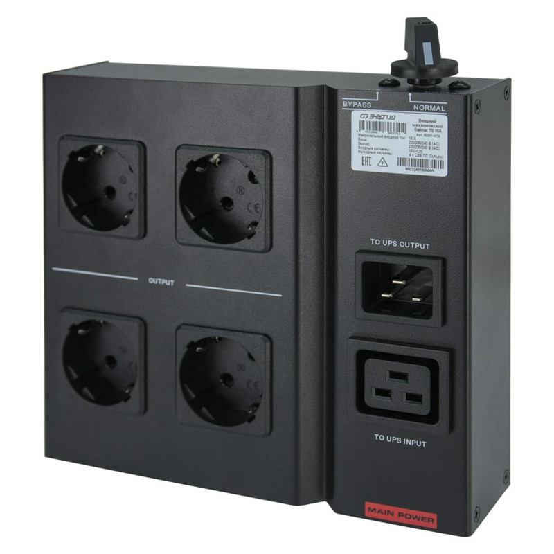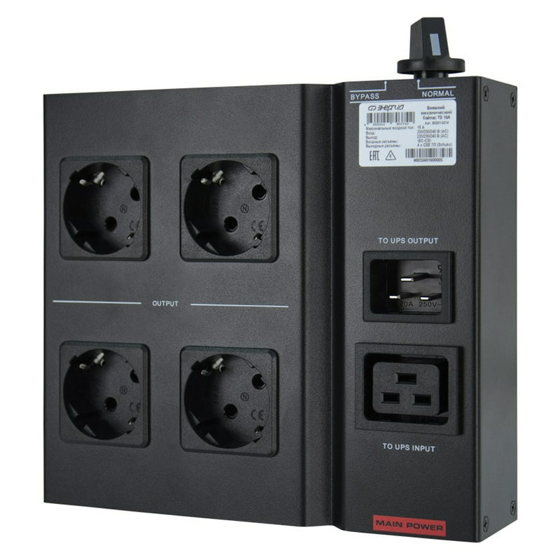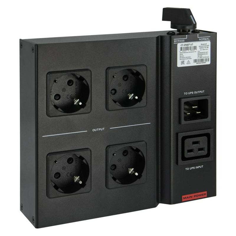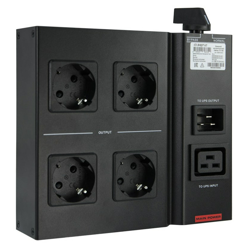 Устройство предназначено для организации ручного, безразрывного переключения питания нагрузки с ИБП на входную сеть для проведения настройки, сервисного обслуживания или замены источника бесперебойного питания. Подключение к сети производится с помощью сетевого шнура. Имеет два режима работы: Байпас (питание нагрузки напрямую от сети, минуя ИБП) и Нормальный (питание нагрузки через ИБП).