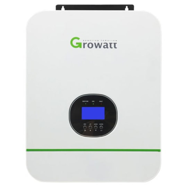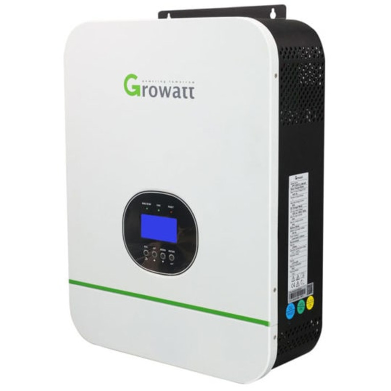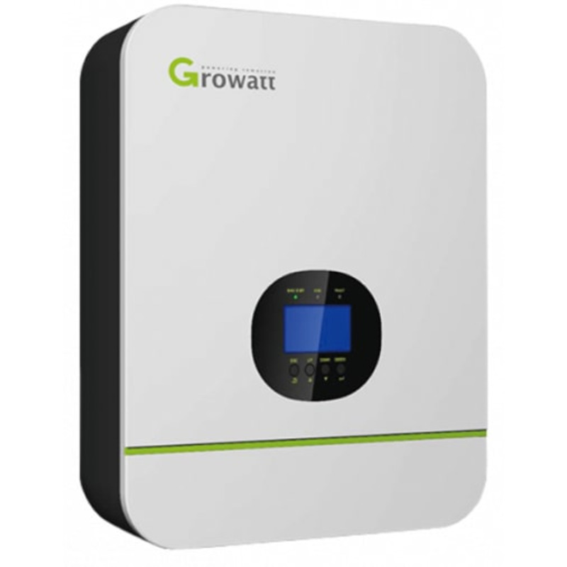 Гибридный солнечный инвертор Growatt SPF3000TL HVM-24V для дома и дачи - многофункциональный инвертор/зарядное устройство мощностью 3 кВт, в котором сочетаются функции инвертора, контроллера заряда аккумуляторов от солнечных батарей и зарядного устройства аккумуляторных батарей от сети 220В для обеспечения бесперебойной подачи питания, с возможностью выбора приоритетов зарядки и нагрузки. Используется в небольших солнечных электростанциях и системах бесперебойного питания.