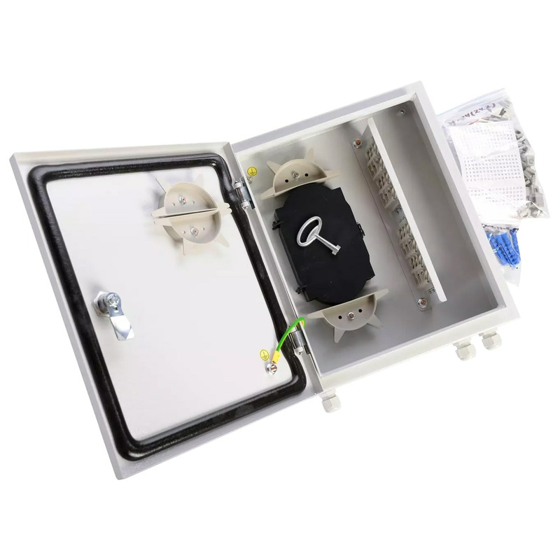 Корпус выполнен из металла, дверь имеет пенорезиновый уплотнитель, место для размещения запаса кабеля, фиксируется точечным замком. Бокс обеспечивает укладку оптического волокна радиусом не менее 30 мм. В корпусе уставлена сплайс-кассета. Кабельные вводы расположены в нижней части бокса, имеют цанговые зажимы. Бокс стандартно комплектуется сменными вставками для установки адаптеров - SC, ST, FC, LC duplex, стяжками, маркерами кабеля, таблицей адресов кроссировки волокон, гильзами КДЗС и комплектом для крепления к стене. Покрытие порошково-полимерное - RAL 7035 (серый).