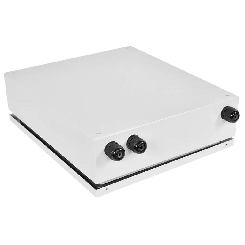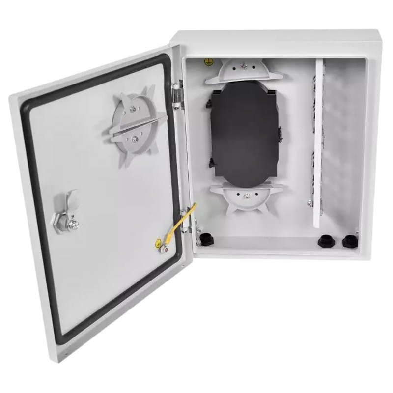 Корпус выполнен из металла, дверь имеет пенорезиновый уплотнитель, место для размещения запаса кабеля, фиксируется точечным замком. Бокс обеспечивает укладку оптического волокна радиусом не менее 30 мм. В корпусе уставлена сплайс-кассета. Кабельные вводы расположены в нижней части бокса, имеют цанговые зажимы. Бокс стандартно комплектуется сменными вставками для установки адаптеров - SC, ST, FC, LC duplex, стяжками, маркерами кабеля, таблицей адресов кроссировки волокон, гильзами КДЗС и комплектом для крепления к стене. Покрытие порошково-полимерное - RAL 7035 (серый).