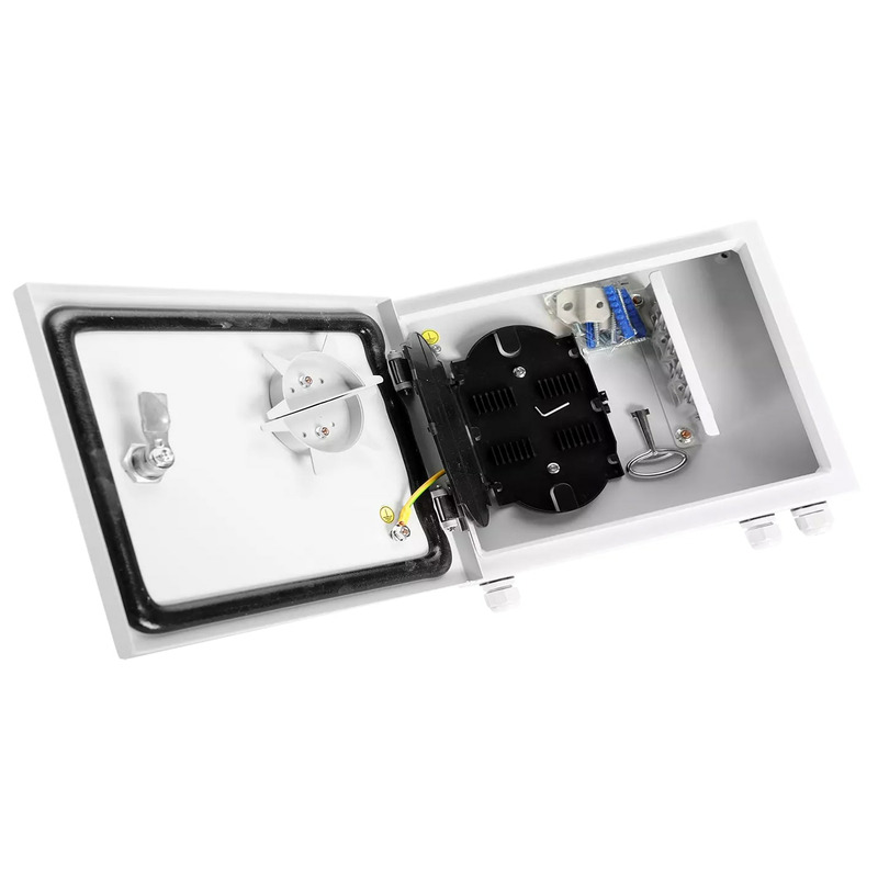 Корпус выполнен из металла, дверь имеет пенорезиновый уплотнитель, место для размещения запаса кабеля, фиксируется точечным замком. Бокс обеспечивает укладку оптического волокна радиусом не менее 30 мм. В корпусе уставлена сплайс-кассета. Кабельные вводы расположены в нижней части бокса имеют цанговые зажимы. Бокс стандартно комплектуется сменными вставками для установки адаптеров - SC, ST, FC, LC duplex, стяжками, маркерами кабеля, таблицей адресов кроссировки волокон, гильзами КДЗС и комплектом для крепления к стене. Покрытие порошково-полимерное - RAL 7035 (серый).
