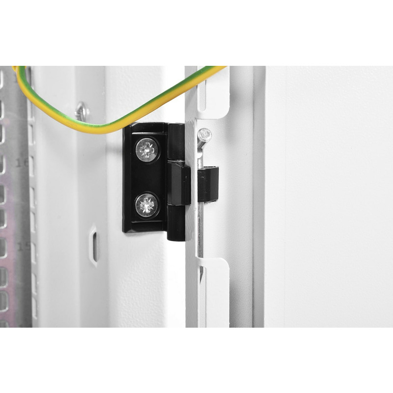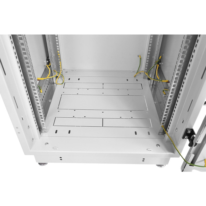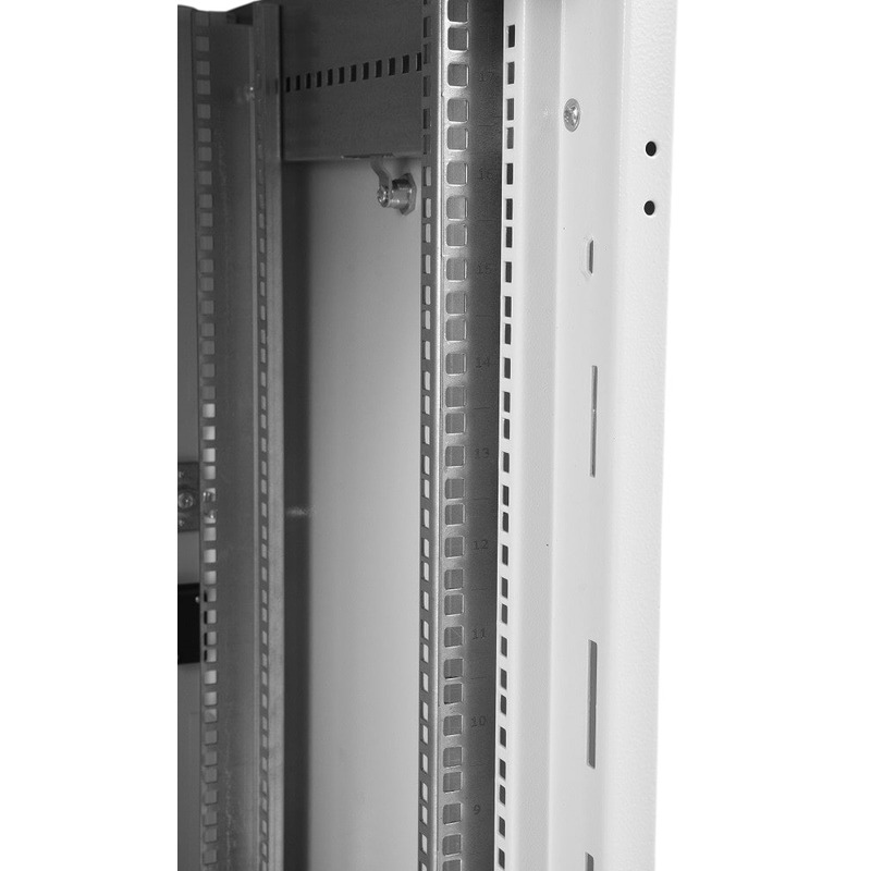 Доступ для монтажа, коммутации и обслуживания оборудования возможен с четырех сторон, через боковые легкосъемные стенки, переднюю и заднюю двери. Шкаф имеет 4 оцинкованные вертикальные направляющие, регулируемые по глубине.