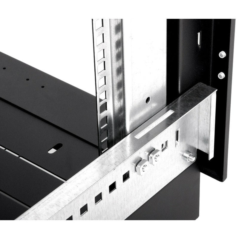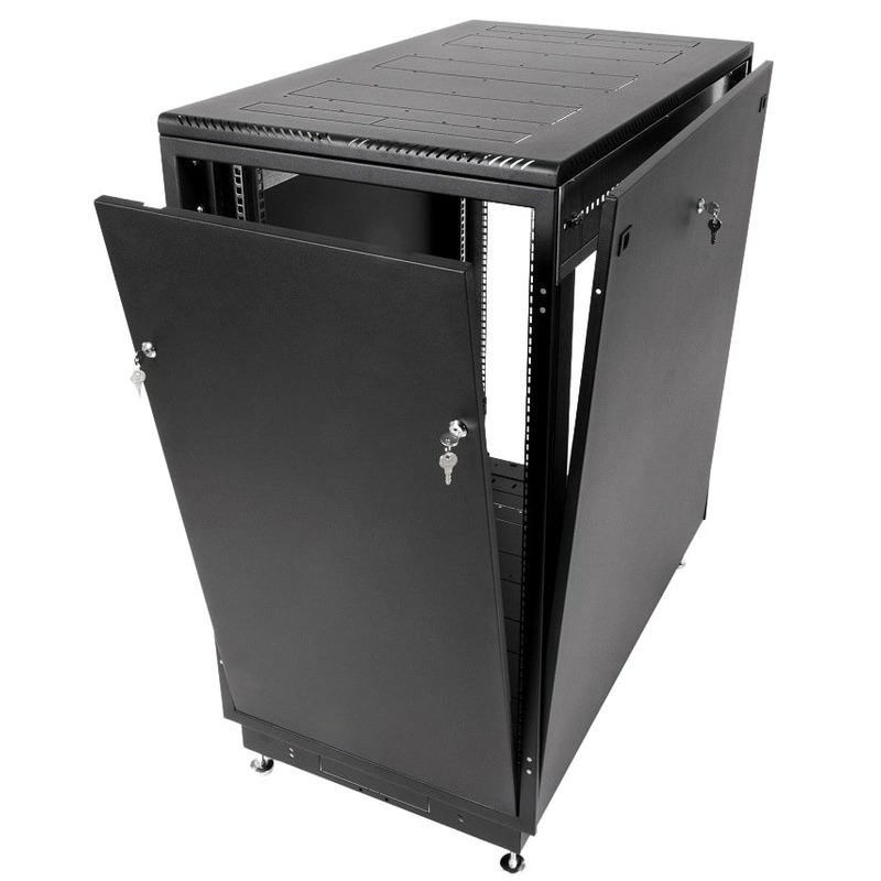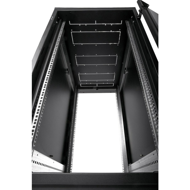 Доступ для монтажа, коммутации и обслуживания оборудования возможен с четырех сторон, через боковые легкосъемные стенки, переднюю и заднюю двери. Шкаф имеет 4 оцинкованные вертикальные направляющие, регулируемые по глубине.