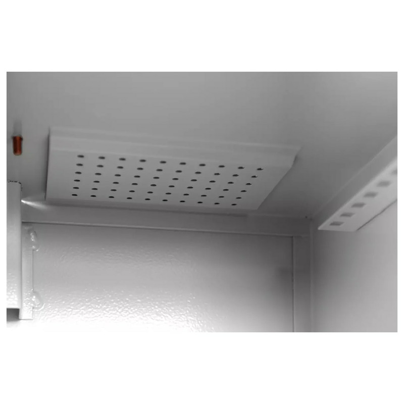 Шкаф имеет цельнометаллическую сварную конструкцию, выполнен из стали толщиной 1,5 мм. Дверь пенального типа имеет ребра жесткости и удобную ручку-углубление. Фиксируется замком, стойким к подбору ключей и механическим повреждениям.
