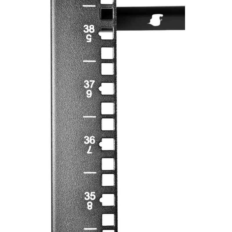 Стойка имеет полностью разборную двухрамную конструкцию. На вертикальные направляющие нанесена юнитовая маркировка. В раме стойки СТК-С предусмотрены отверстия для безинструментального монтажа блоков розеток REM.