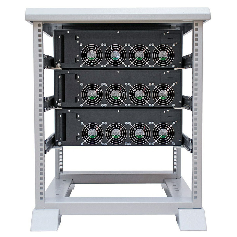 Стабилизаторы IS8000RT установлены в металлической двухрамной стойке высотой 12U, предназначенной для открытого и компактного размещения специализированной техники стандарта 19 дюймов. Также устройства могут устанавливаться вертикально на ровной горизонтальной поверхности с помощью специальных упоров. Все детали для крепления входят в комплект поставки устройства.