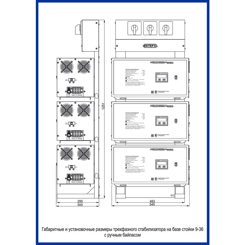 Стойка для стабилизаторов Lider 9-36 с ручным байпасом предназначена для установки стабилизаторов напряжения настольного (настенного) исполнения. В стойке размещен блок коммутации ручного байпаса по каждой фазе, смонтированы и выведены наружу провода для удобства подключения стабилизаторов к стойке и клеммные колодки для подключения к сети и нагрузке.