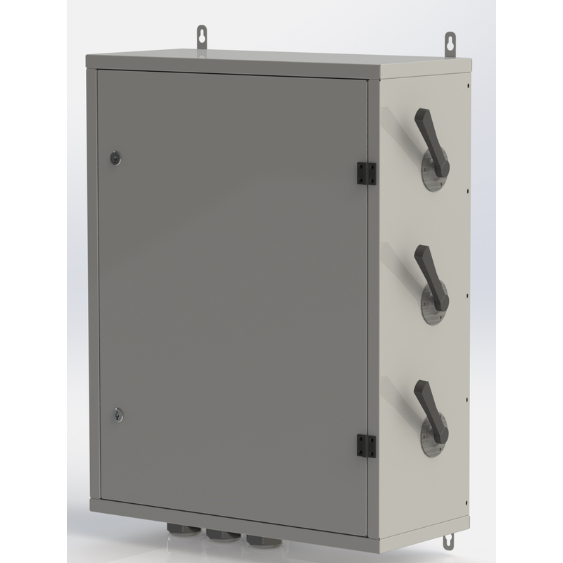 Внутри щита расположены клеммные блоки для подключения его к сети, стабилизаторам и потребителю. На боковой стенке щита расположены ручные рубильники байпаса, индикаторы наличия входного напряжения, а также трехпозиционный переключатель для выбора фазы питания контактора нагрузки. Щит можно навесить на стену.