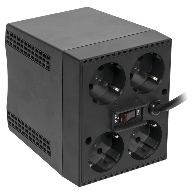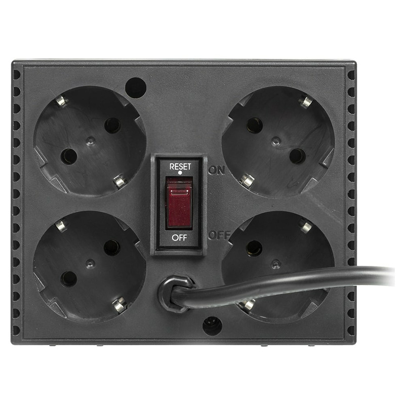 Бытовые стабилизаторы напряжения серии ТСА обеспечивают надежную работу компьютерной и прочей электронной техники при понижении или повышении напряжения электросети там, где не требуется батарейная поддержка. Компактный корпус стабилизатора вмещает 4 выходные евророзетки с заземлением (4 x CEE 7/4) на задней панели с защитой от проникновения посторонних предметов и надежной фиксацией вилок любых типов. Для защиты от перегрузки и короткого замыкания на выходе предусмотрен автоматический выключатель. После устранения причины проблемы выключатель легко возвращается в исходное состояние одним нажатием.