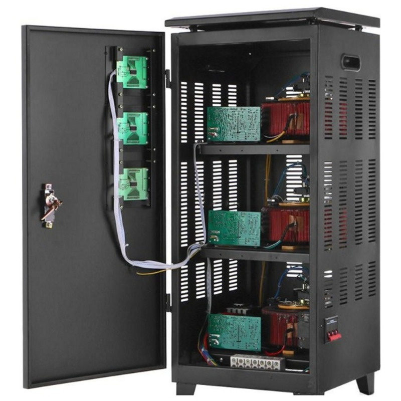 Стабилизатор состоит из трех однофазных силовых схем, установленных в едином корпусе, управление которыми производится общим микропроцессором.