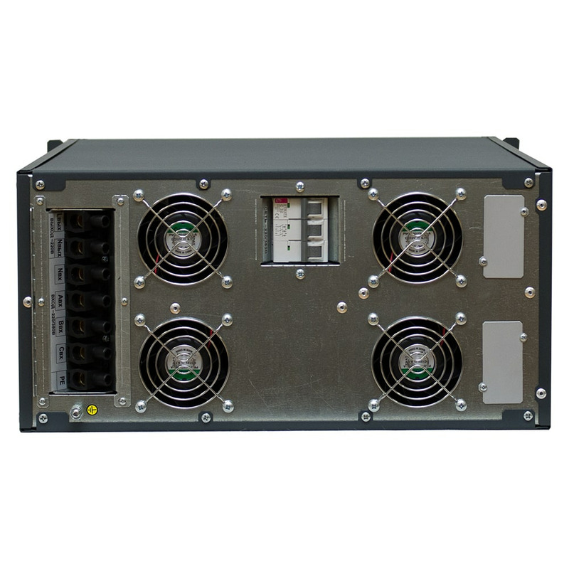 На передней панели устройства расположены четыре светодиодных индикатора («Сеть», «Выход», «Байпас», «Авария») и цифровой ЖК-дисплей для просмотра параметров работы (состояния входной и выходной сети, мощности нагрузки, температуры внутри стабилизатора и др.) и конфигурации, в том числе выбора значения выходного напряжения и режима работы (стандартный, ECO/байпас). Для подключения к сети электропитания и подключения нагрузки используются клеммная колодка и вводной автомат, расположенные на задней панели стабилизатора. Там же находятся два слота для опциональной установки карт мониторинга.