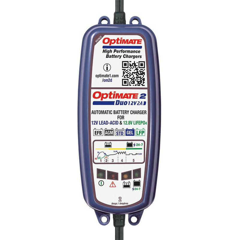 Зарядное устройство Optimate 2 DUO TM550 позволяет заряжать, десульфатировать, хранить и тестировать свинцово-кислотные аккумуляторные батареи от 6 до 96 Ач. Ток заряда составляет 2.0 А.